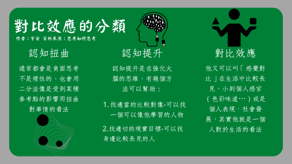 有常常有時候都會很常比較最多的就是身高,他的類別兩種各別是:認知提升、認知扭曲,這兩種,像是認知扭曲就是因為某種參考點而認定到錯誤的知識,認知提升是比較正向,是提升大腦強化的方法,也推薦可以去找自己的對象(是值得學習的對象)以上就是這兩個~