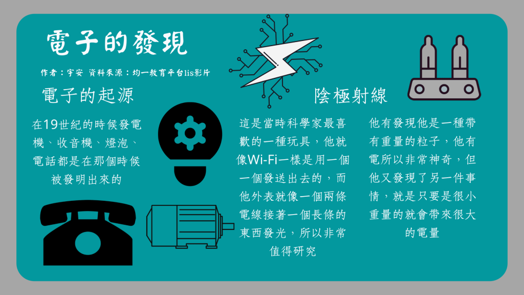 這次我做了,跟上學期一樣的看完影片做成知識圖卡的回家任務,而這次的主題是電子的發現,他就是在說像我們現在生活中的冰箱、冷氣、電風扇、發電機之類這些電子產品或家具,他們的起源都是在19世紀的時候就有了,這個讓我印象深刻,想說原來有些東西也這麼久了,但是像電話這麼有歴史就很可惜變成手機被取代掉了。