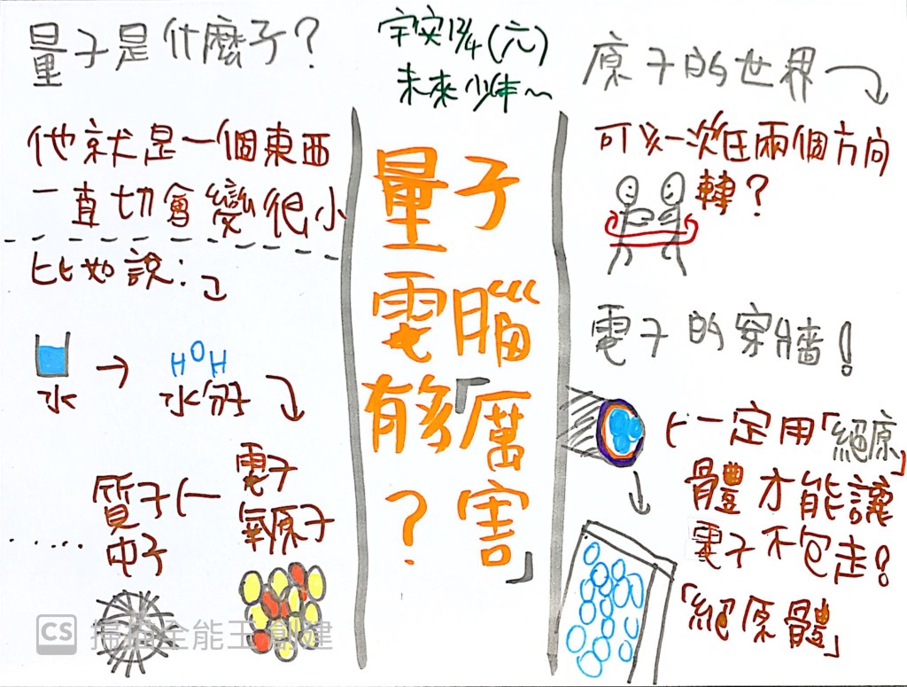 這次的未來少年我是直接隨便挑了一本沒做過的,所以就抽到了這一本,他叫做「量子電腦有多厲害?」因為我裡面最印象深刻的就是發現了上次做過均一教育平台的影片也有出現過的中子和質子還有原子,這幾個就是因為他們被切分成很小的元素,所以有這麼多種,像電子我也覺得蠻有印象的,因為常常生活當中都會有,像是有一些電線都有絕緣的防止漏電之類的狀況,所以裡面有很多偏向生活化的。